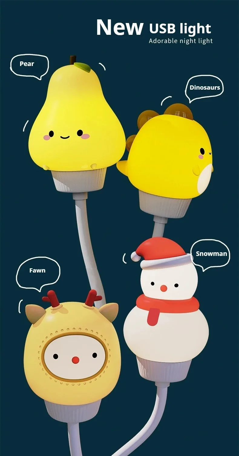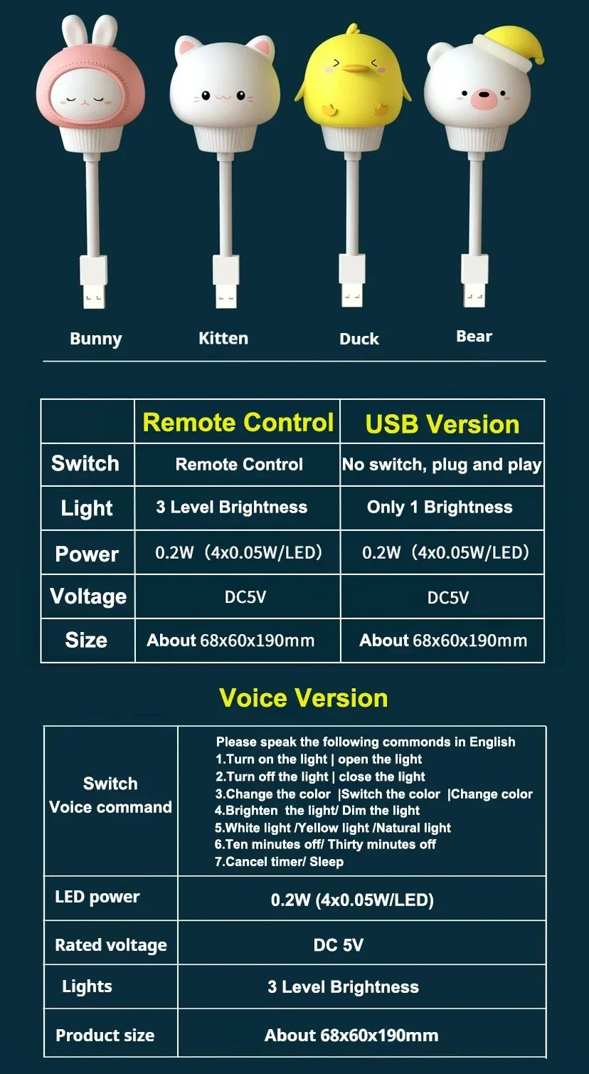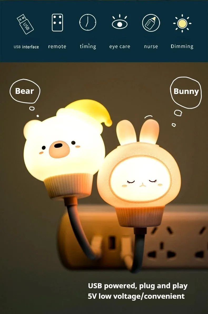 Cute Cartoon Bear Kitten USB Night Light - LED Voice Control Bedside Lamp with Remote for Baby Kid Bedroom Decor